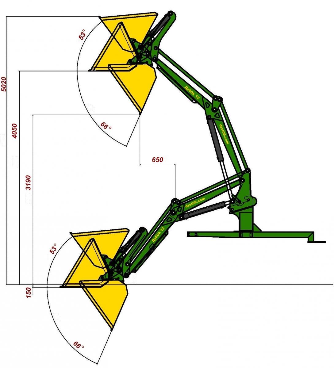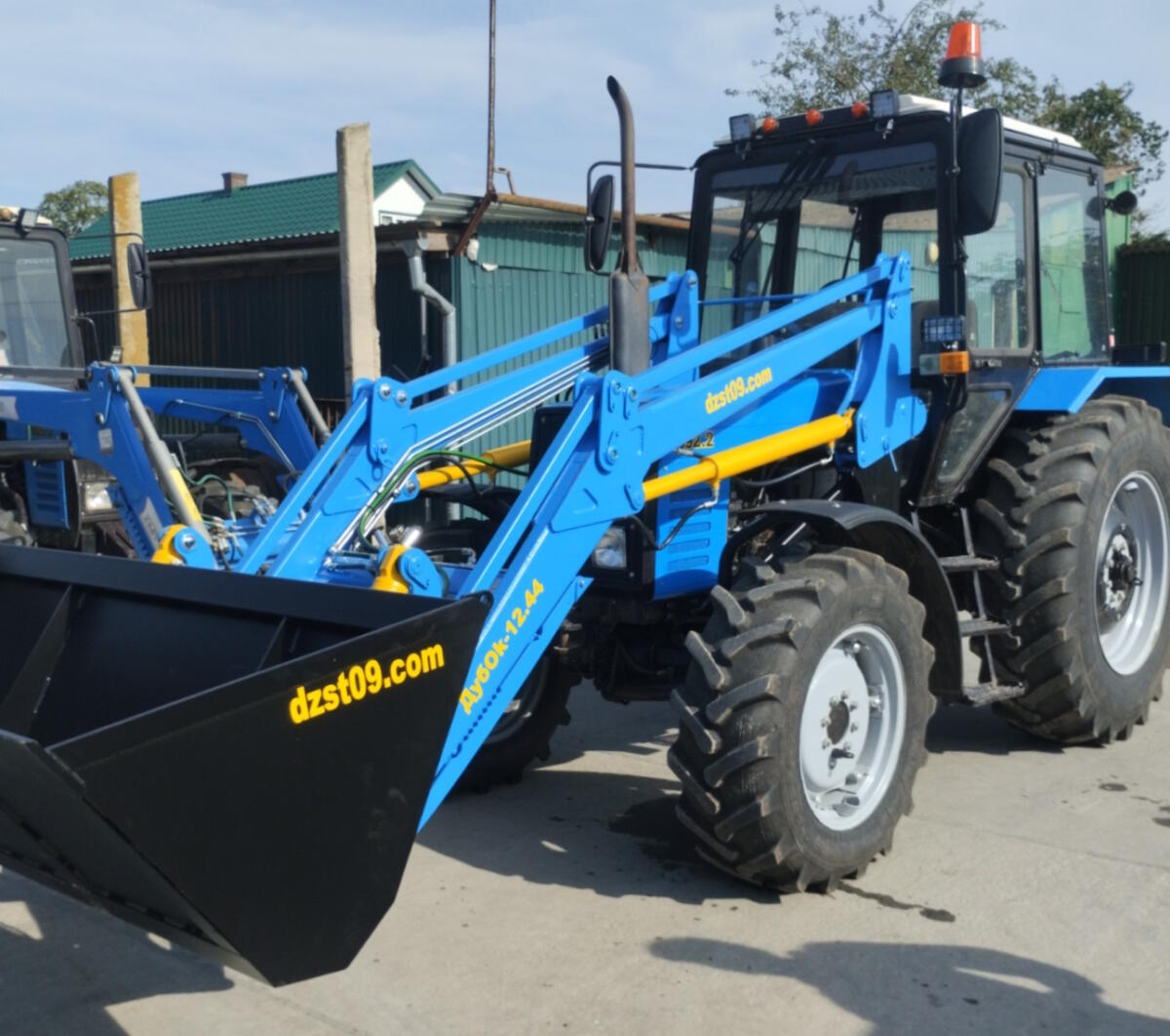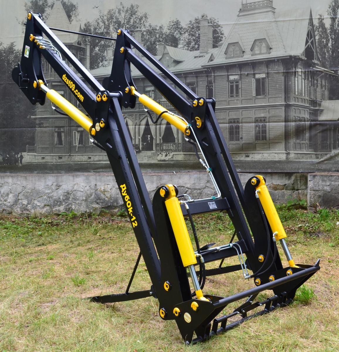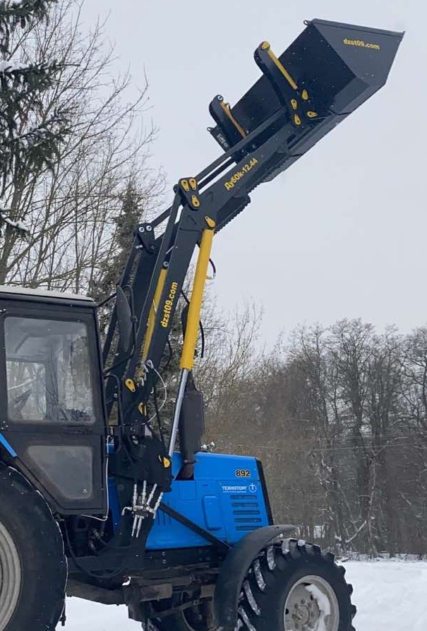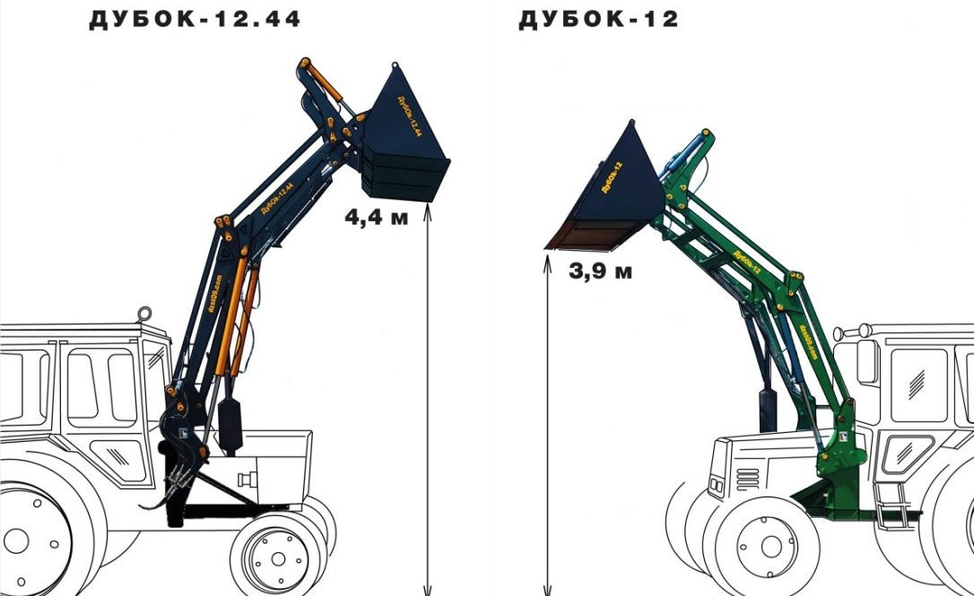 Погрузчик фронтальный быстросъемный ДубOk-12.44 (проект 2020) является модификацией погрузчика ДубOk-12 (проект 2015). Он устанавливается на колесные тракторы семейства МТЗ и аналоги. Сохранив основные преимущества погрузчиков первого поколения, в новой модели предусмотрена увеличенная до 4,4м высота разгрузки, полуавтоматическое закрытие рамки EURO и другой механизм присоединения стрелы.